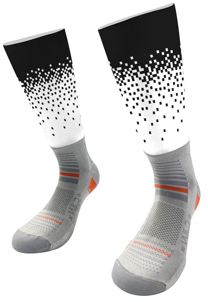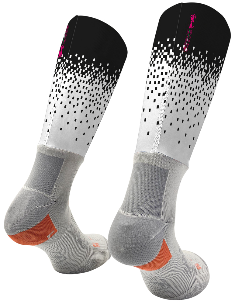 “Socks” è completamente personalizzabile nella parte superiore della calza costruita con materiale elastico, resistente e traspirante che, grazie alla fascia in silicone anallergico, mantiene la sua posizione durante la pedalata.