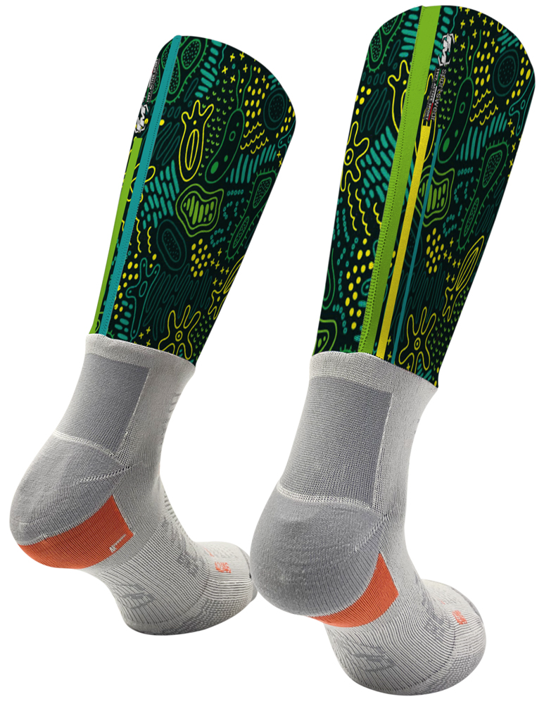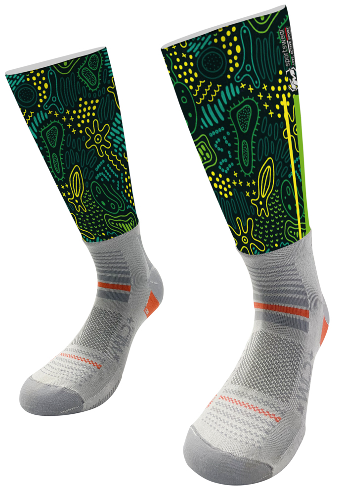 “Socks” è completamente personalizzabile nella parte superiore della calza costruita con materiale elastico, resistente e traspirante che, grazie alla fascia in silicone anallergico, mantiene la sua posizione durante la pedalata.