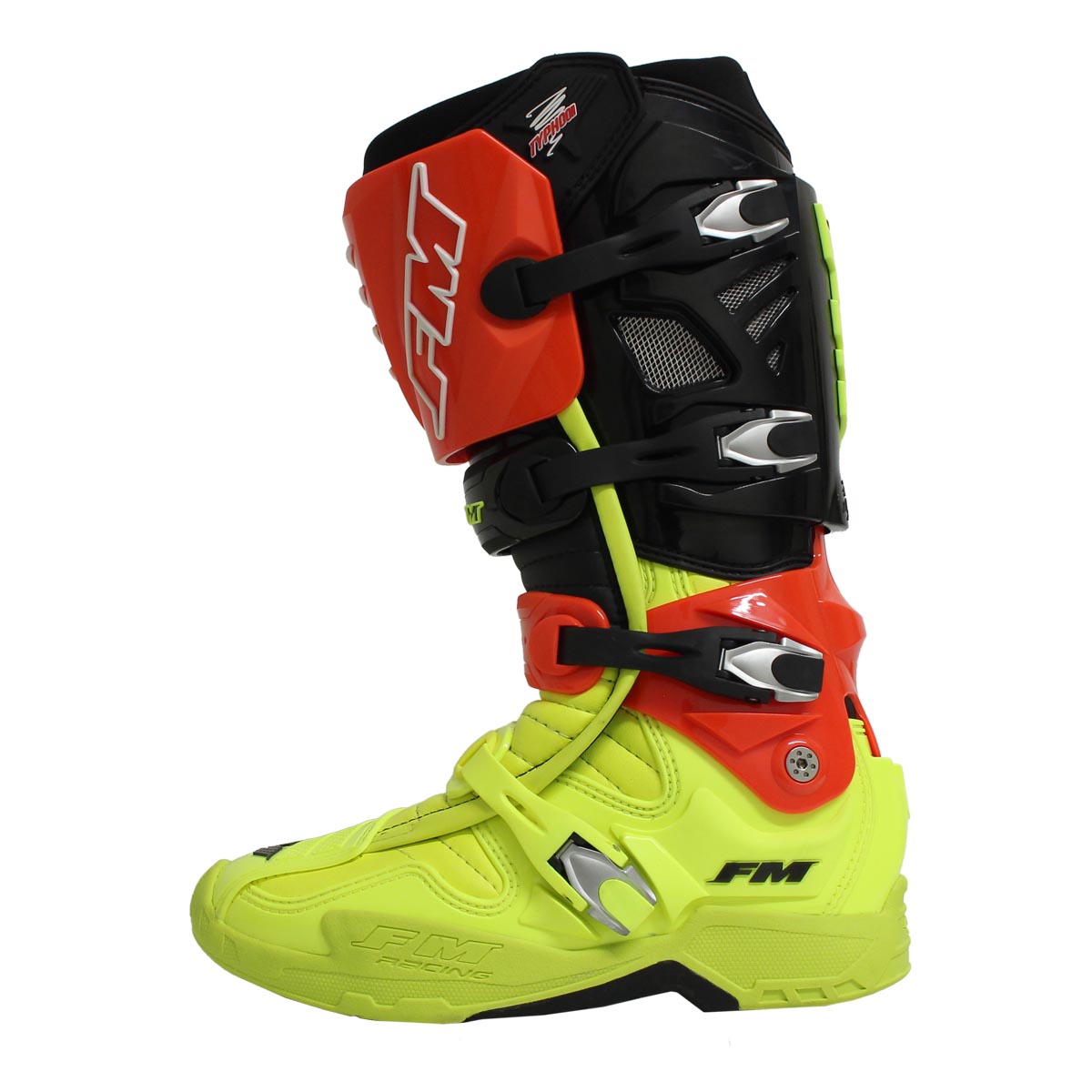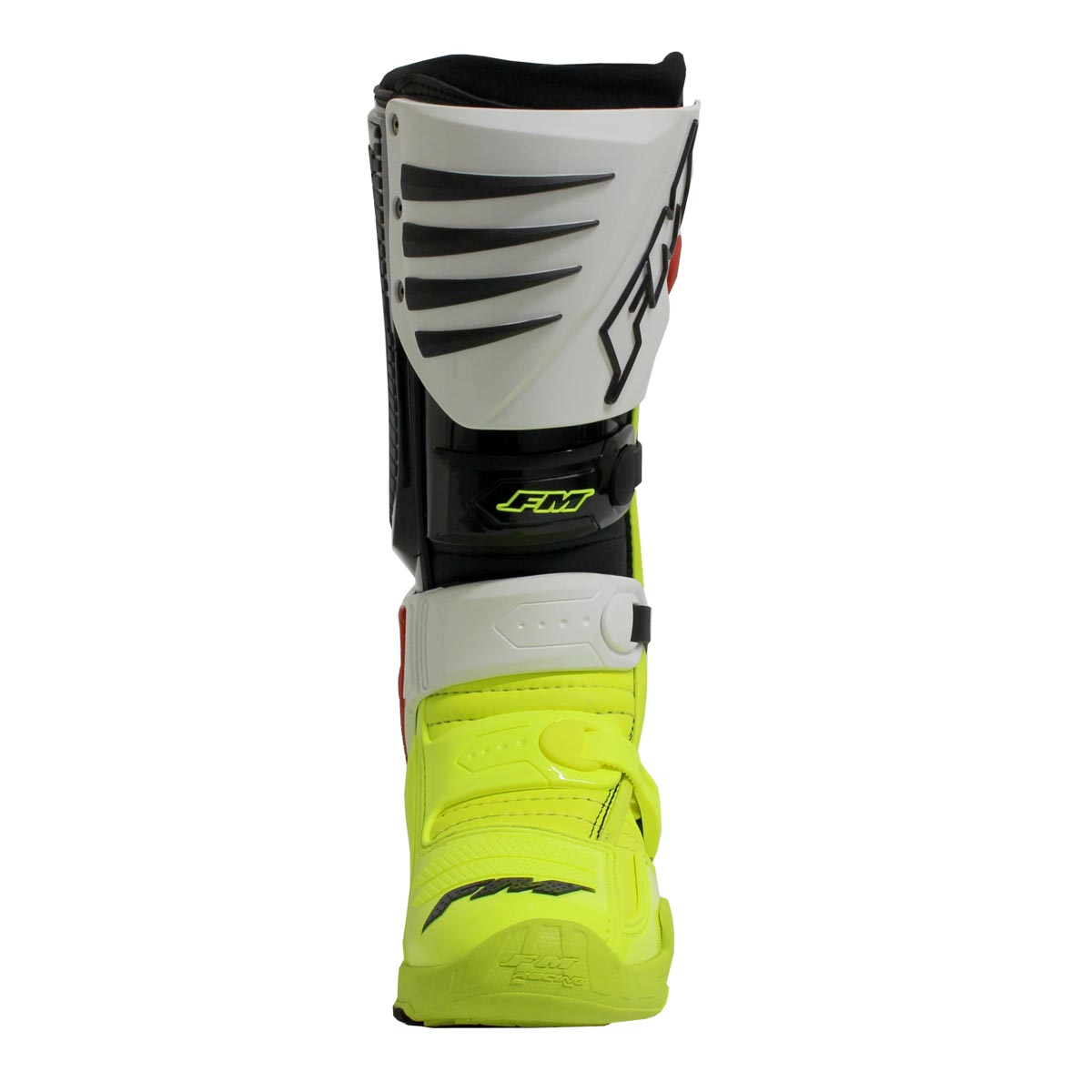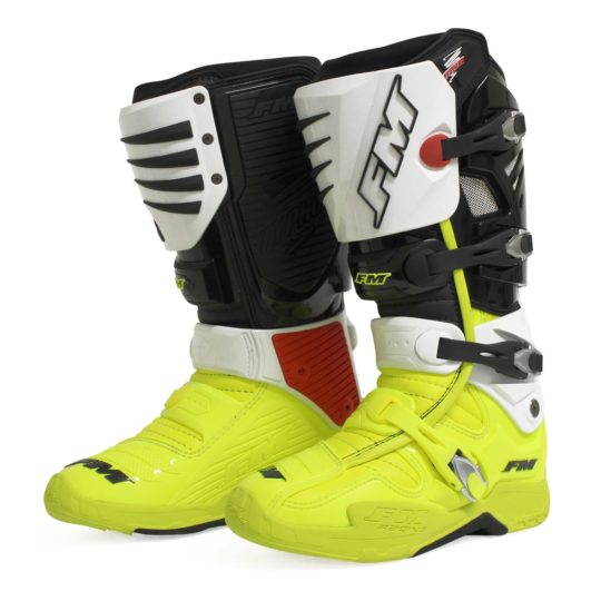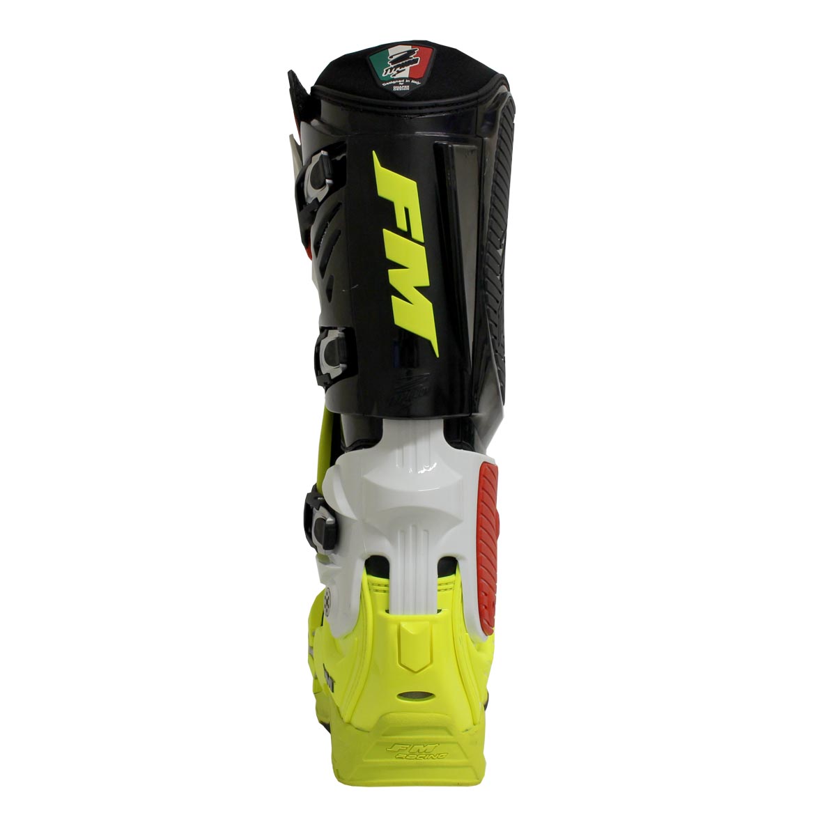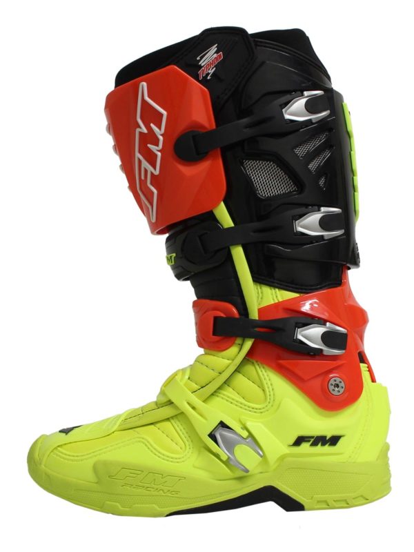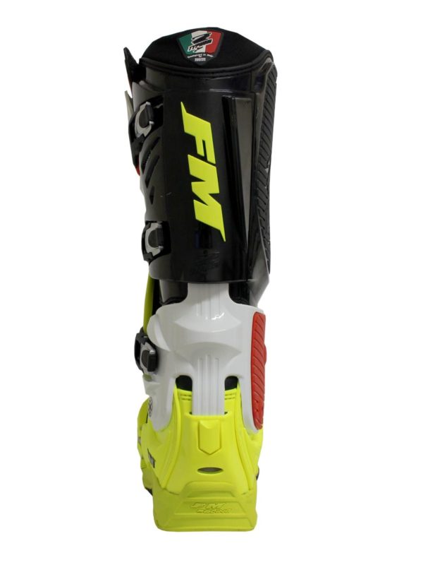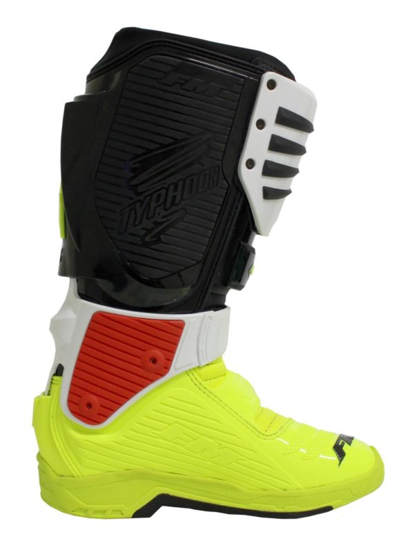 Costruito seguendo un progetto esclusivo FM RACING lo stivale TYPHOON è dotato di funzioni di sicurezza e comfort. L’esclusivo snodo TFP – Total Flex Protection , che consente la naturale flessibilità dei tuoi piedi e delle gambe, pur mantenendo una rigida forma laterale. Ogni fibbia dello stivale è costruita in lega di alluminio per una chiusura sicura. Le suole termosaldate e resistenti agli idrocarburi con sistema antishock e rinforzate con all’interno un anima in acciaio per una maggiore rigidità, protezione e resistenza. La parte centrale della suola, può essere sostituita per ridare allo stivale nuova vita.Il confort interno garantito da una fodera traspirante e dal gel interno ergonomicamente posizionato per il supporto della caviglia aiuta a mantenere i piedi ben saldi sulle pedane. Lo stivale TYPHOON è dotato di parti rimovibili e sostituibili, tra cui suola, fibbie, plantare snodo TFP e placca frontale, in modo da poter ricostruire o sostituire parti dello stivale usurate. Dopo l’acquisto è importante considerare che lo stivale per raggiungere un ottima flessibilità e aumentare la sensibilità deve superare un rodaggio di almeno due turni di allenamento, dopo potrete godere a pieno delle caratteristiche dello stivale.